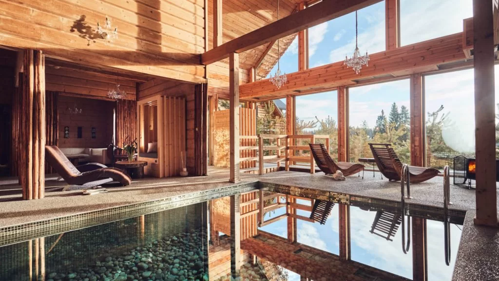 Zbudowany w nawiązaniu do tradycyjnego ludowego stylu ze świerkowych bali, zachwyca designerskimi wnętrzami, łączącymi surowe drewno, szkło, kamień i len. To harmonijna mieszanka tradycji i nowoczesności, minimalizmu i luksusu.